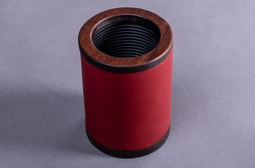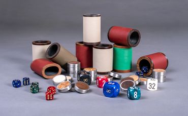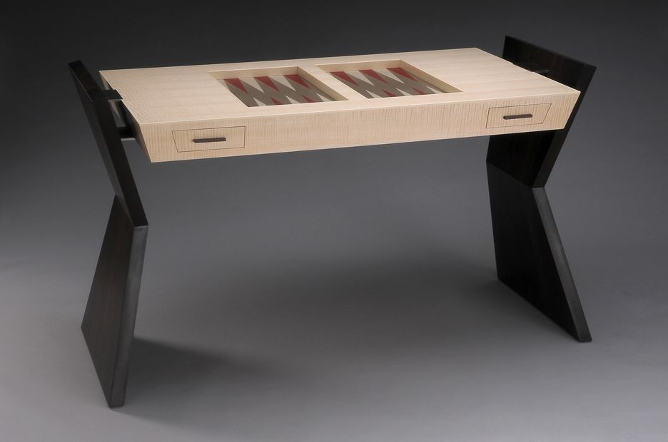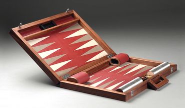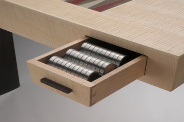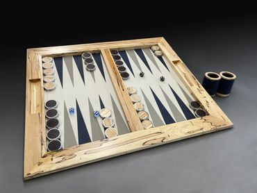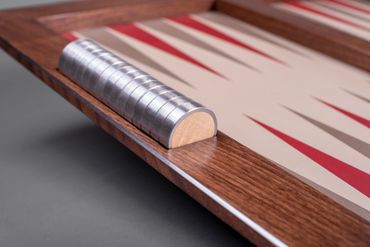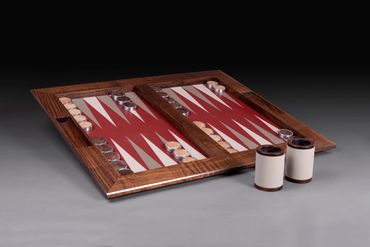 I have taken the best characteristics of the boards I have encountered in tournaments and chouettes and incorporated them into my designs. The boards are aesthetically pleasing, comfortable to play and withstand years of constant use. The dice cups and playing pieces are handmade with the same leather, wood and stainless steel that comprise the boards.